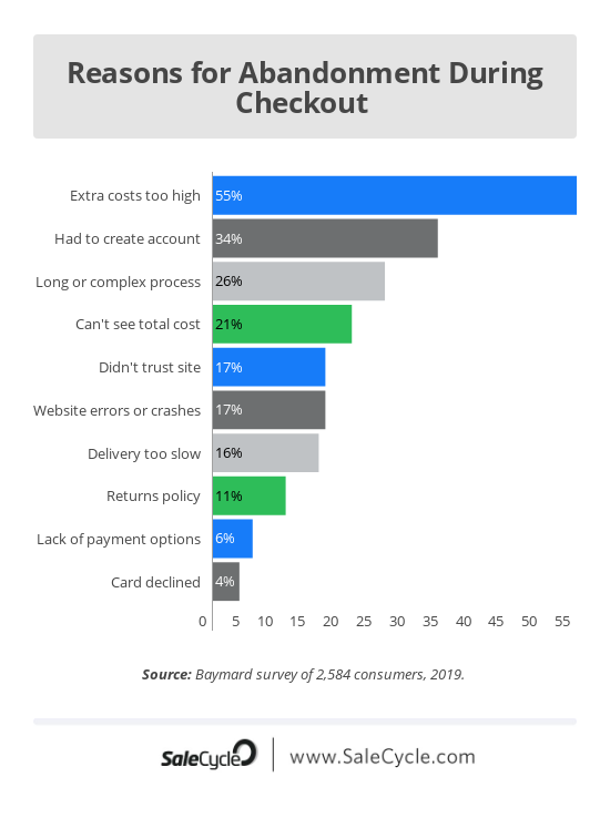 80% of customers abandon a cart after adding a product to it. And the reasons behind this are complex processes, lack of payment options, technical glitches, account creation, etc.