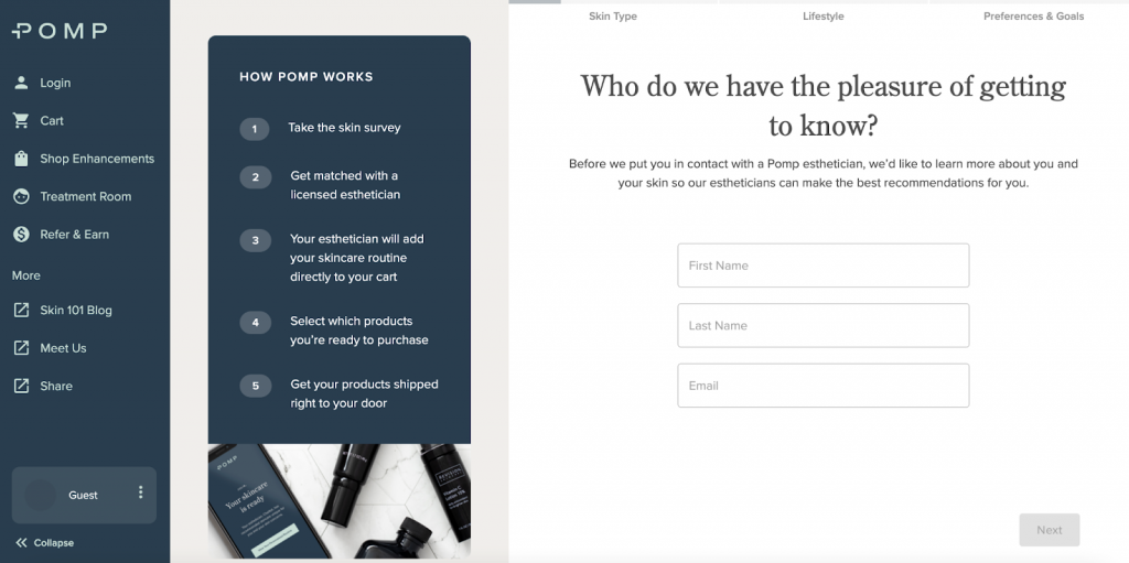 Pomp. They ask customers to take a survey on their site; this helps them recommend products that are unique to the customer’s needs.