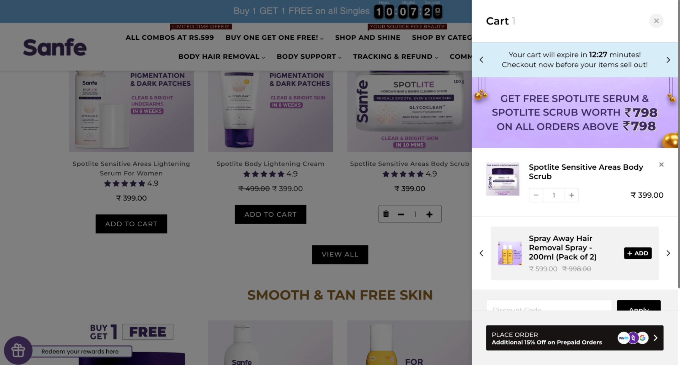 If you look at the image below, it clearly shows how Sanfe has put up a timer on the top of its left checkout window to promote quick and impulsive buyings. Showing additional recommendations is another way to make consumers quickly add add-ons to their cart and complete the purchase to leverage the existing offer.