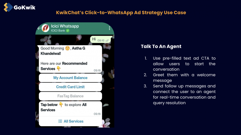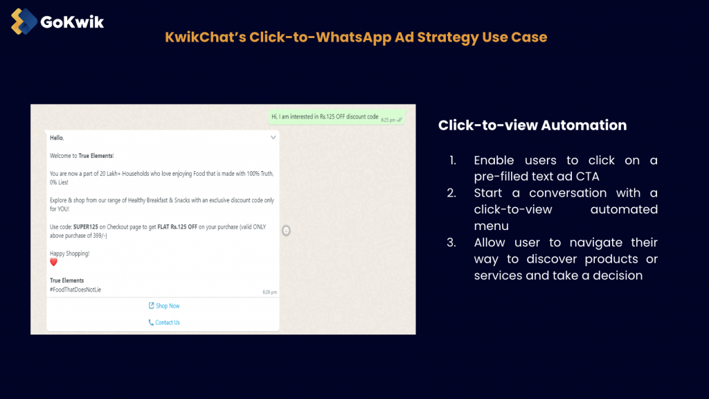 When running ads on various platforms like Google, Facebook, Instagram, etc., direct users to your business WhatsApp using a pre-filled text CTA. Avoid taking them to one of your website’s landing pages and then asking them to explore your products or services or fill a contact form.